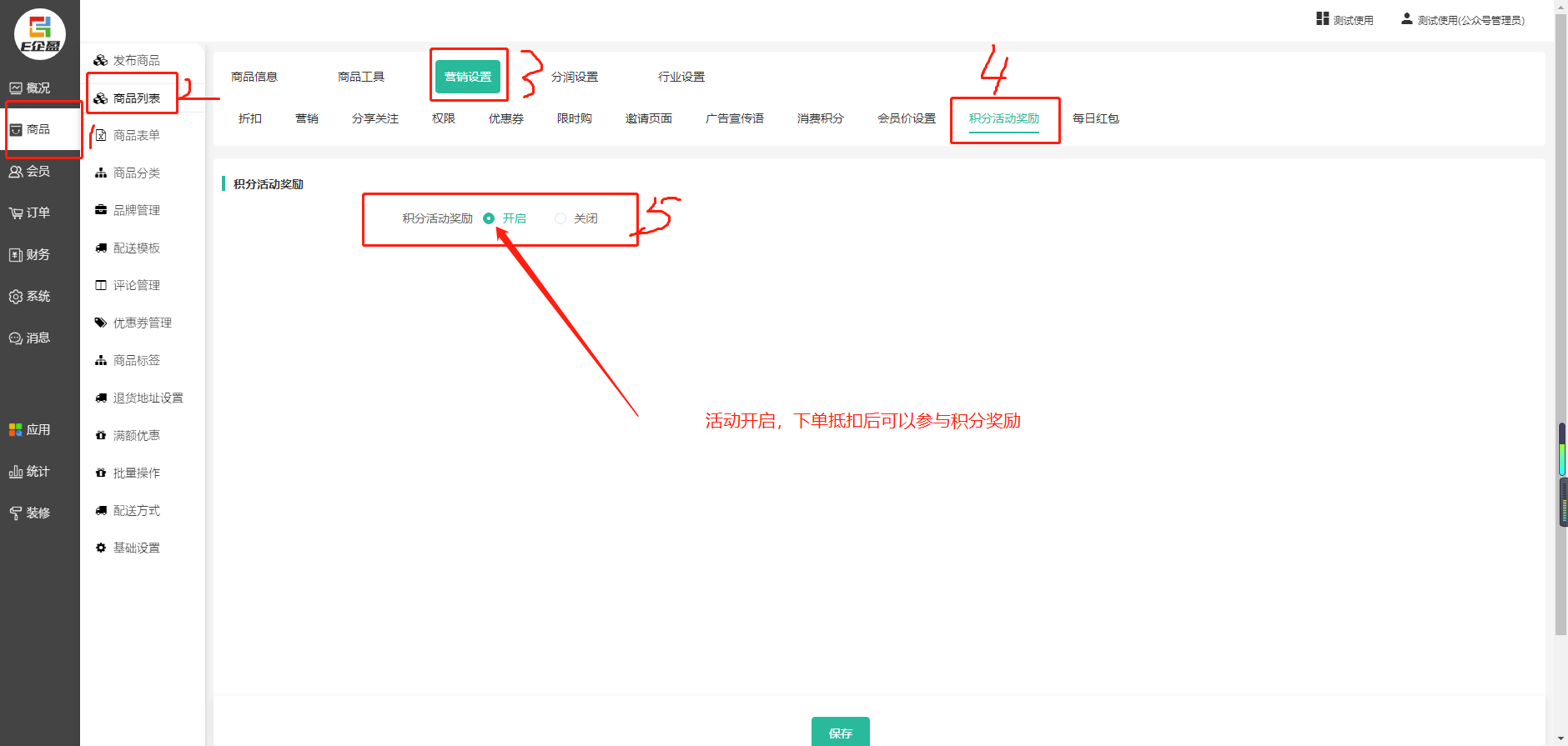 1、购买参与积分活动奖励的商品订单。支持所有商品参与。以平台自营商品为例。 商品开启参与积分活动奖励。 商品积分活动奖励是默认关闭的,部分商品参与积分活动,要先单独开启。