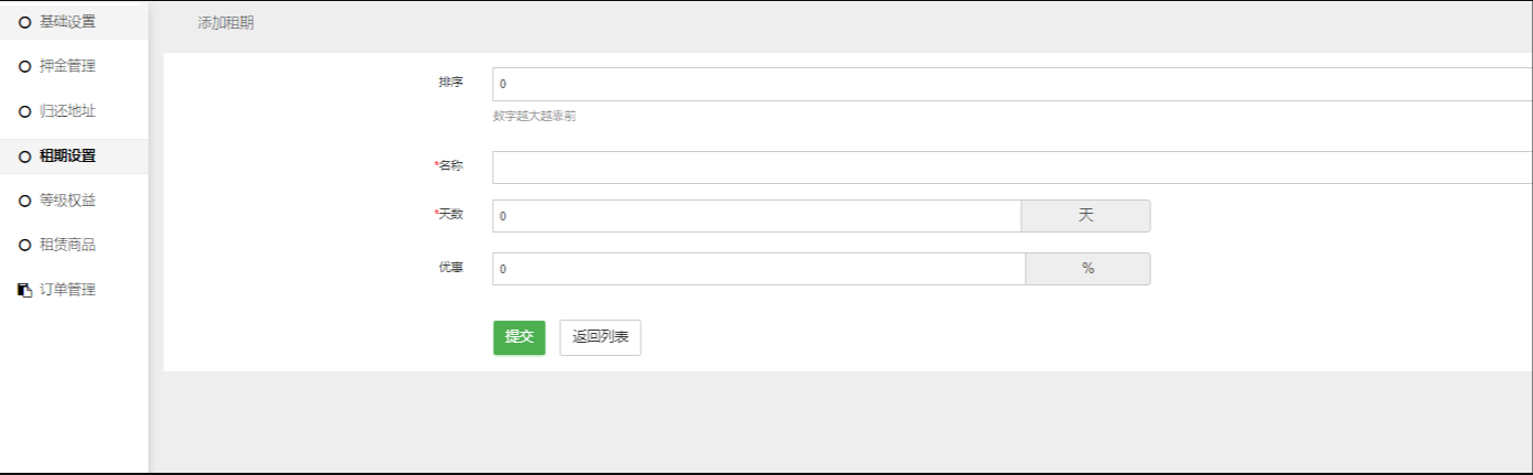 添加租期后,用户租赁下单是可以快速选择租期,并且享受对应租期的优惠;用户也可以自定义设置租期,自定义设置的租期优惠按照小于设置的租期最接近的一个优惠执行。